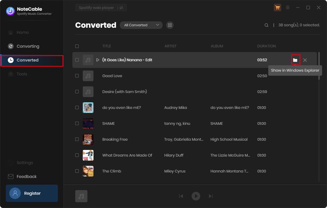 Once downloaded, they will be stored in the local storage, in the destination folder. After the conversion is completed, click the Converted part, and you will find downloaded songs listed here. Click the folder icon behind the Duration, you can reach out to the local folder of your computer and you can also change the location of the songs at the same time.
