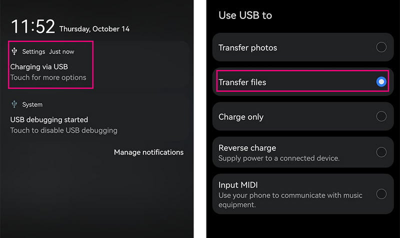 Step 2: Pull down the notification window on your Android device, then activate File Transfer mode.